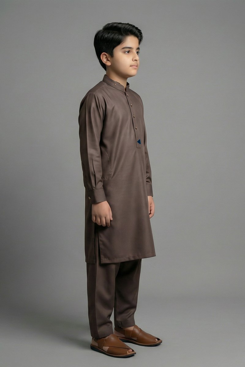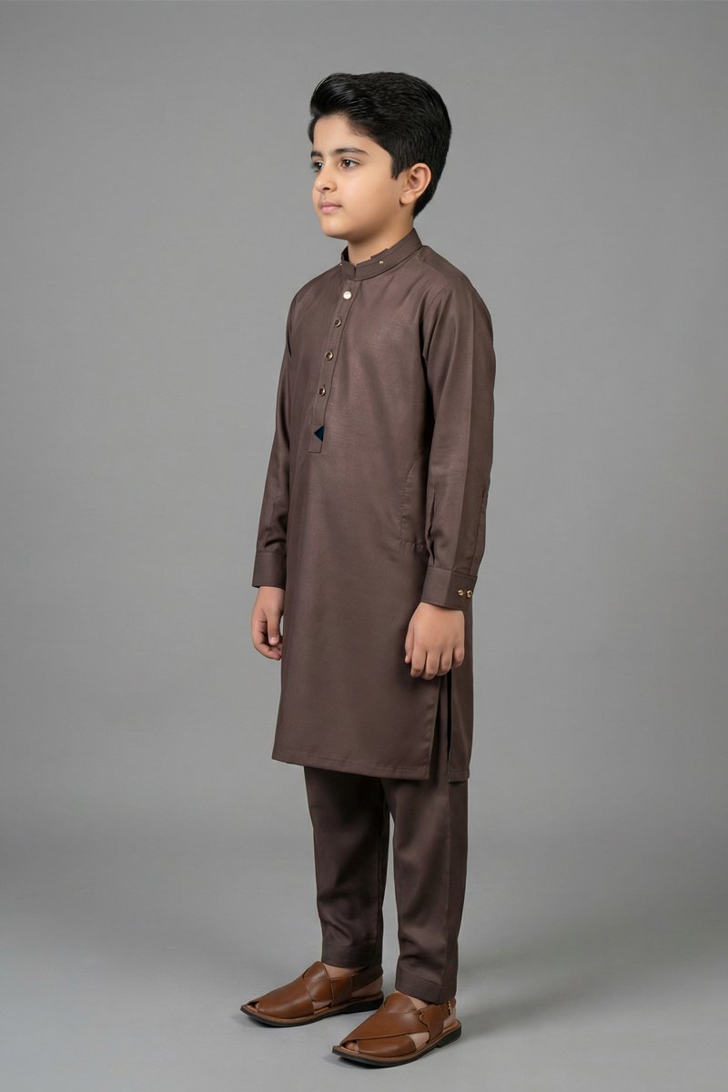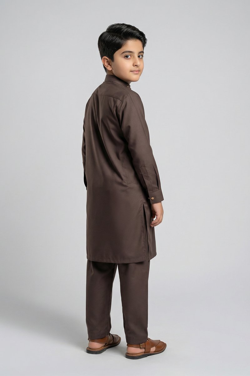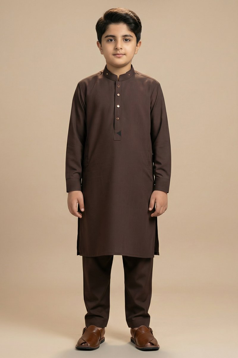 This chocolate-colored kurta pajama for kids combines a traditional look with a warm, rich brown tone. The clean tailoring and soft fabric make it suitable for Eid, weddings, family gatherings, and cultural events. Designed for comfort, it allows children to move freely while keeping a neat and polished appearance.