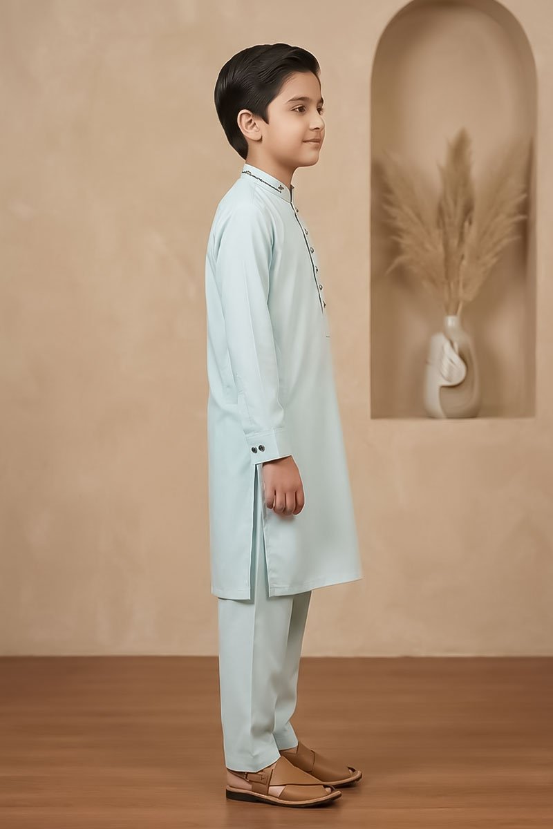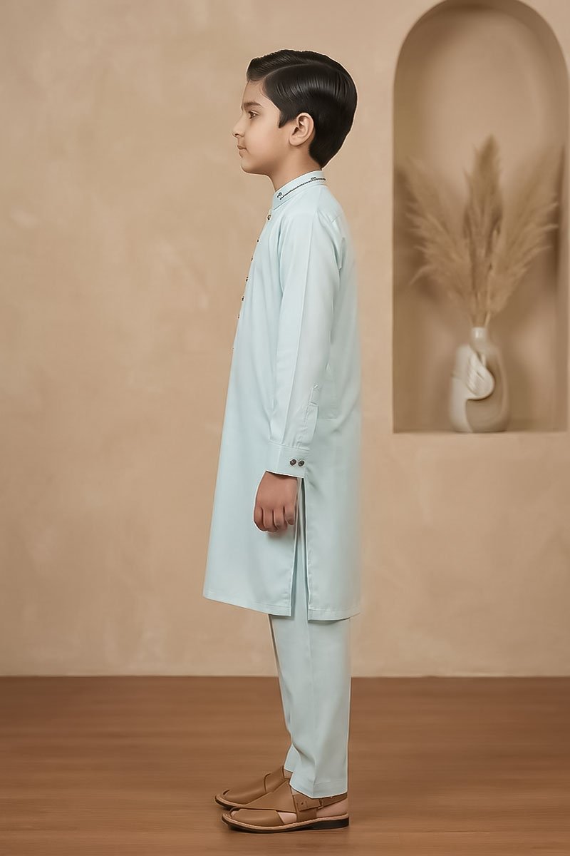 This pastel mint green kurta pajama for kids offers a soft, modern twist on a traditional outfit. The light, refreshing tone keeps the look subtle while still standing out at weddings, Eid celebrations, family gatherings, and cultural events. Designed for comfort and ease of movement, it allows kids to stay active without feeling restricted.